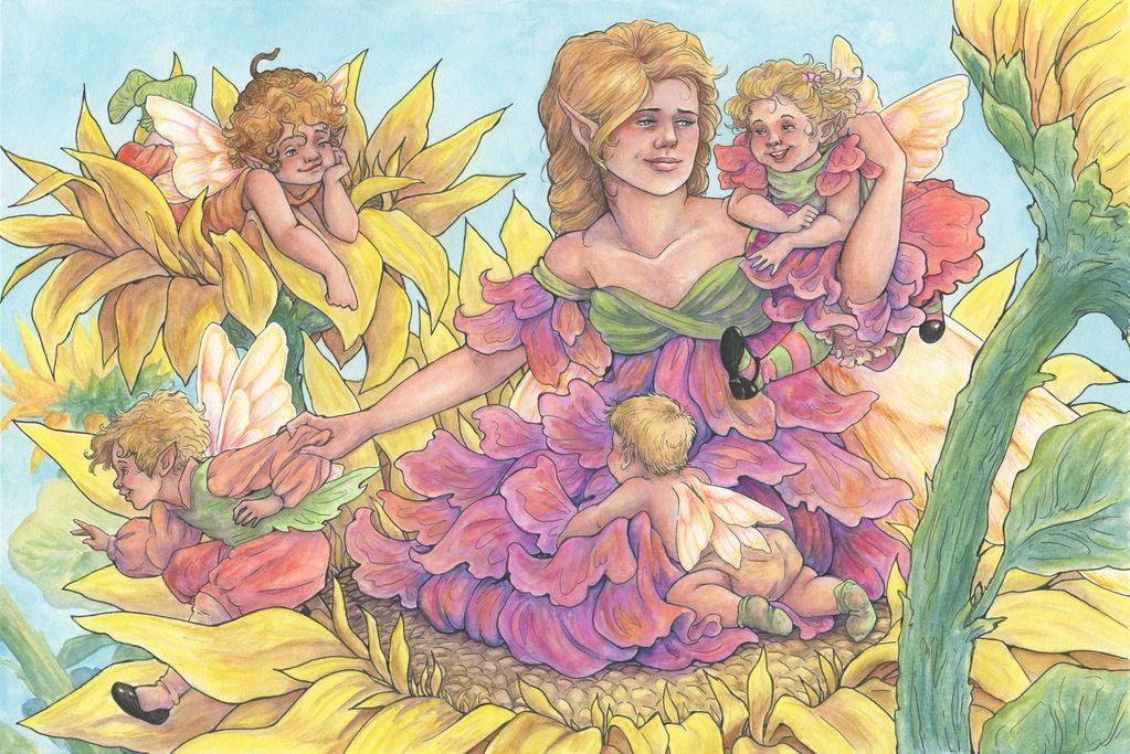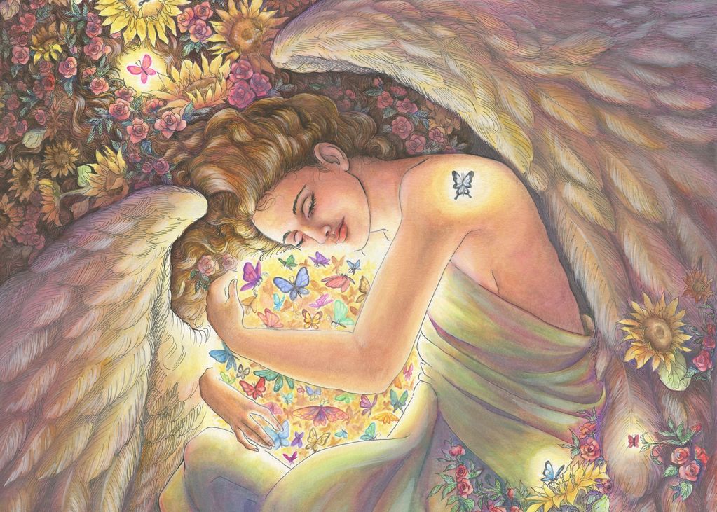 The winged figure is seen holding an orb of butterflies, with some scattered throughout the sunflowers and roses the figure lays upon intertwining in the hair, clothing, and wings.