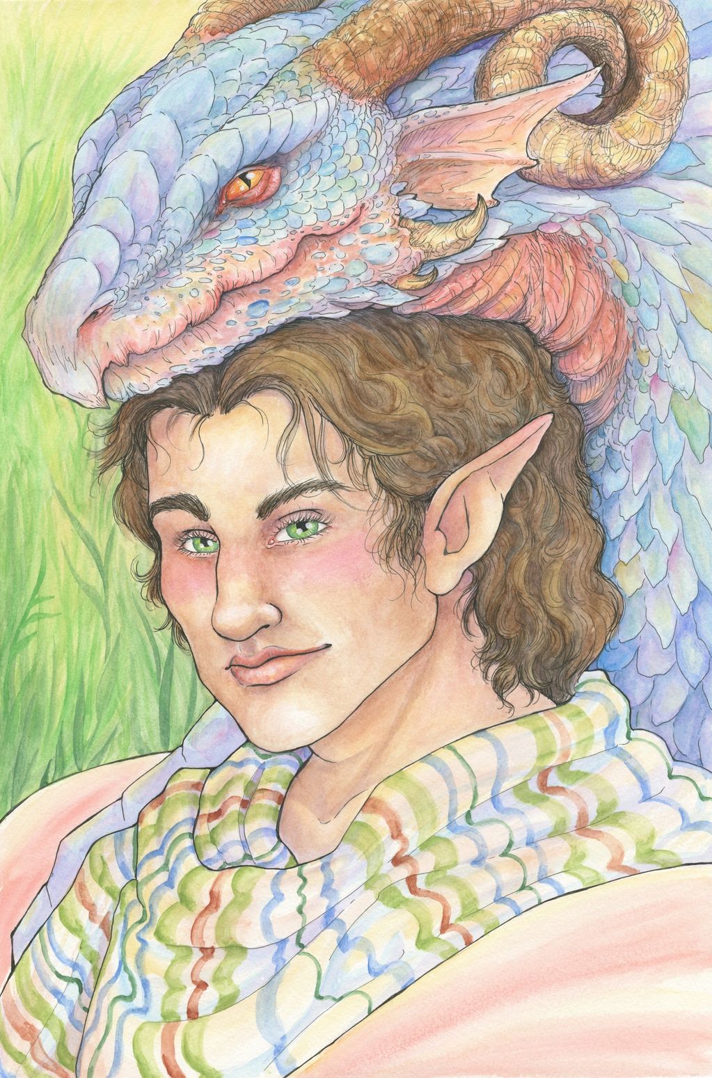 A male figure is seen with his "sheep dog" dragon, in the grass. Hannah's challenge which turned out well was the scarf. Adding a rippling ribbon pattern that makes the piece catch a glimpse of something normal in the fantasy world.